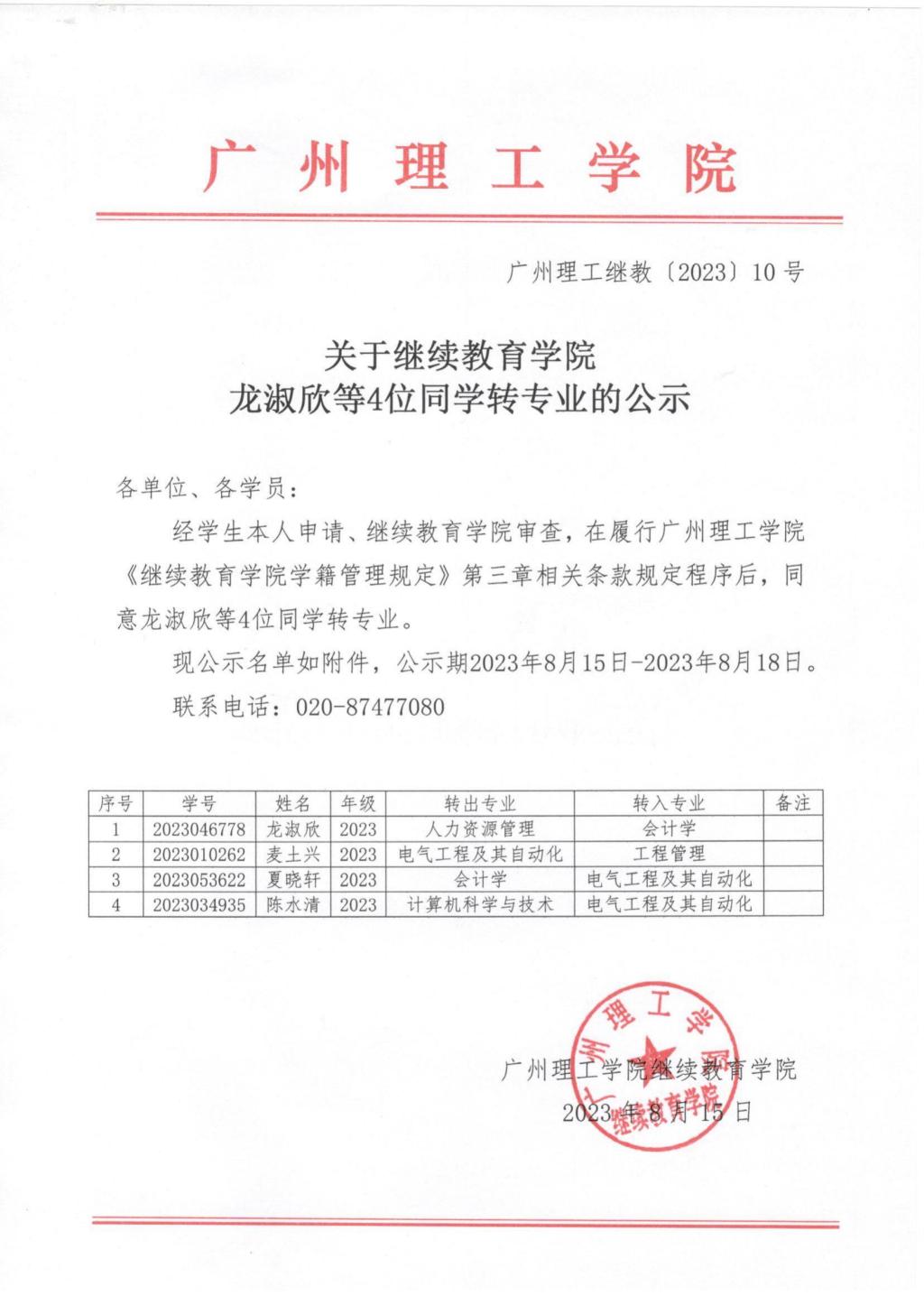 关于伟德国际victor19462023级龙淑欣等4位同学转专业的公示_