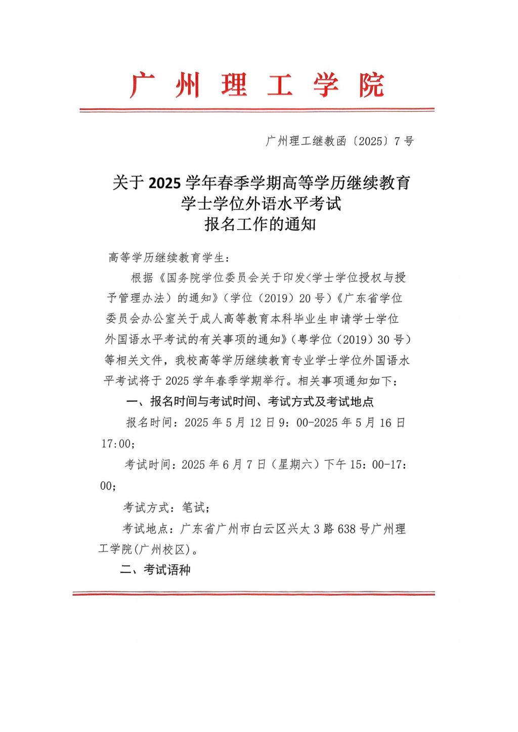 关于2025学年春季学期高等学历继续教育学士学位外语水平考试报名工作的通知
