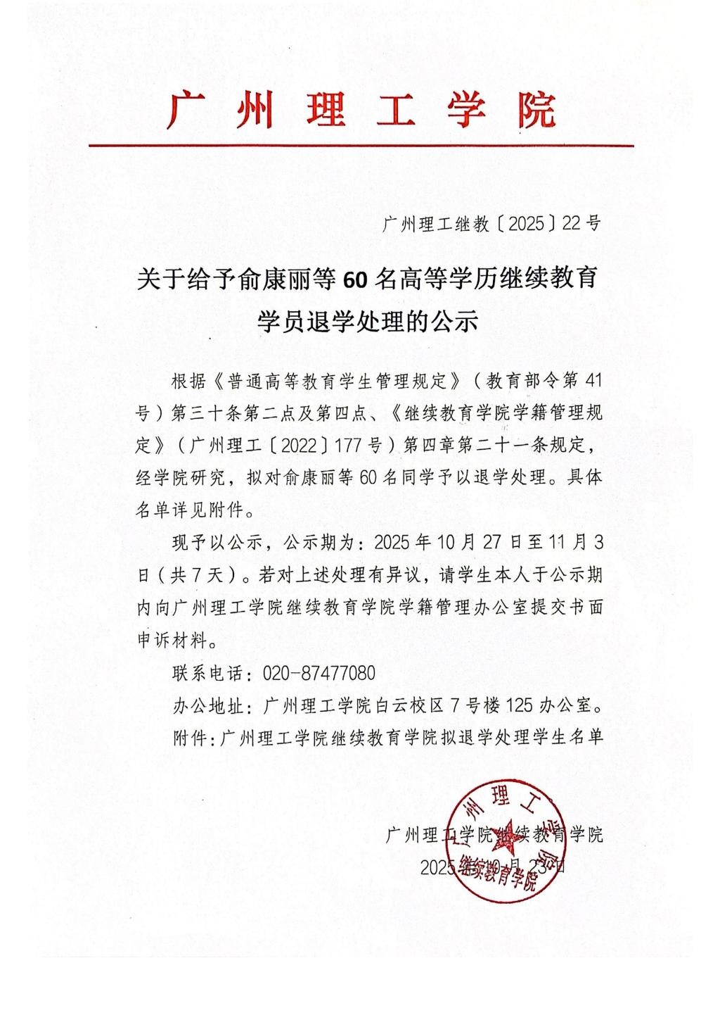 关于给予俞康丽等60名高等学历继续教育学员退学处理的公示