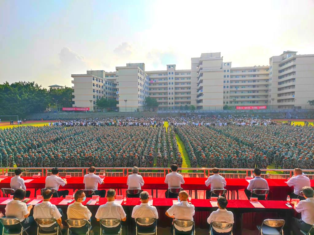 9月6日,2021级新生军训动员大会在大足球场隆重举行。党委书记黄圣诚、副董事长肖海、白云区人民武装部参谋谢伟超、机关部处和各党总支负责同志、出席,全体普高新生和伟德国际victor1946新生参加。党委书记黄圣诚为军训团授旗。