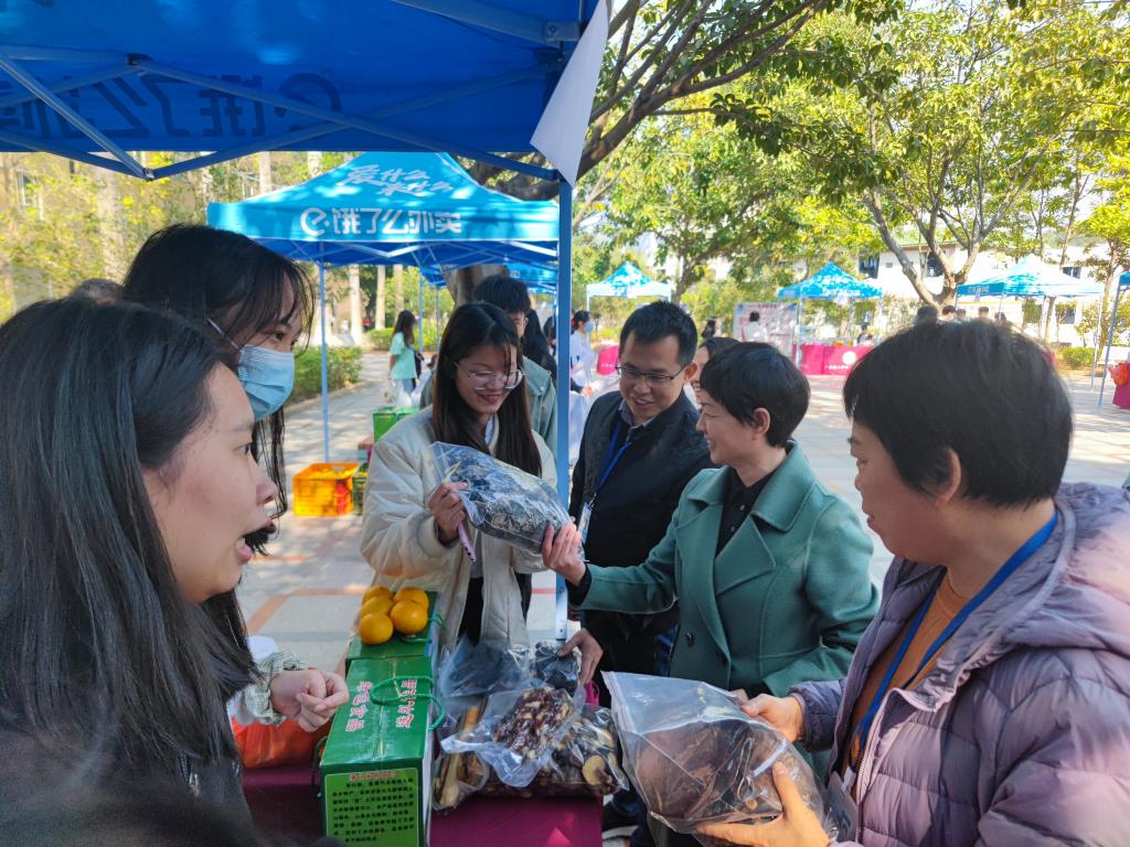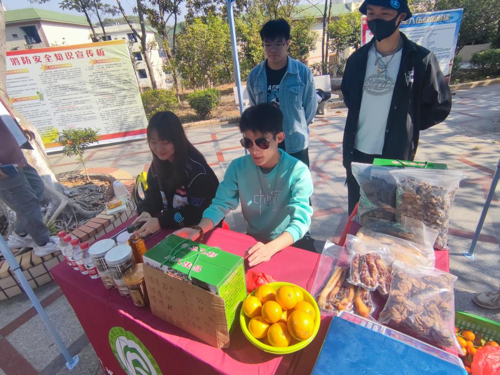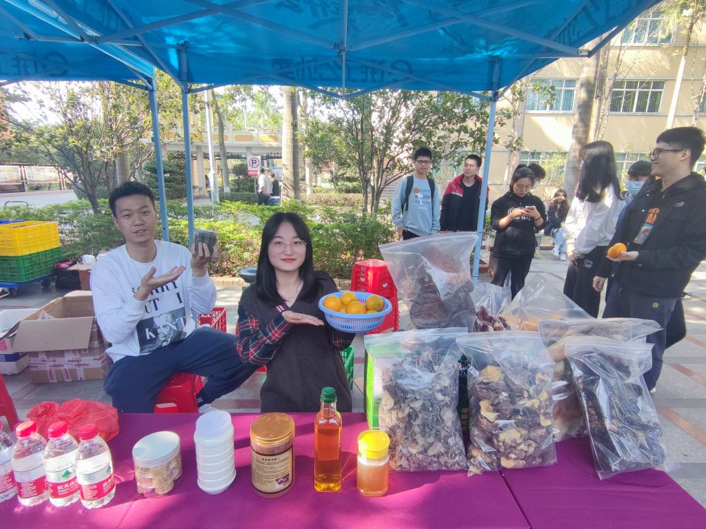 展销会上,始兴县司前镇特色农产品、特色美食摆满了广场,皇帝柑、沙糖桔、土蜂蜜、灵芝、香菇、木耳、米饼、蕉宇粉等特色农产品琳琅满目,吸引了很多师生。这些来自粤北山地大自然的山珍,通过同步直播,在师生的助力销售下走向千家万户。至下午四时,线下销售407单、销售额26458元。