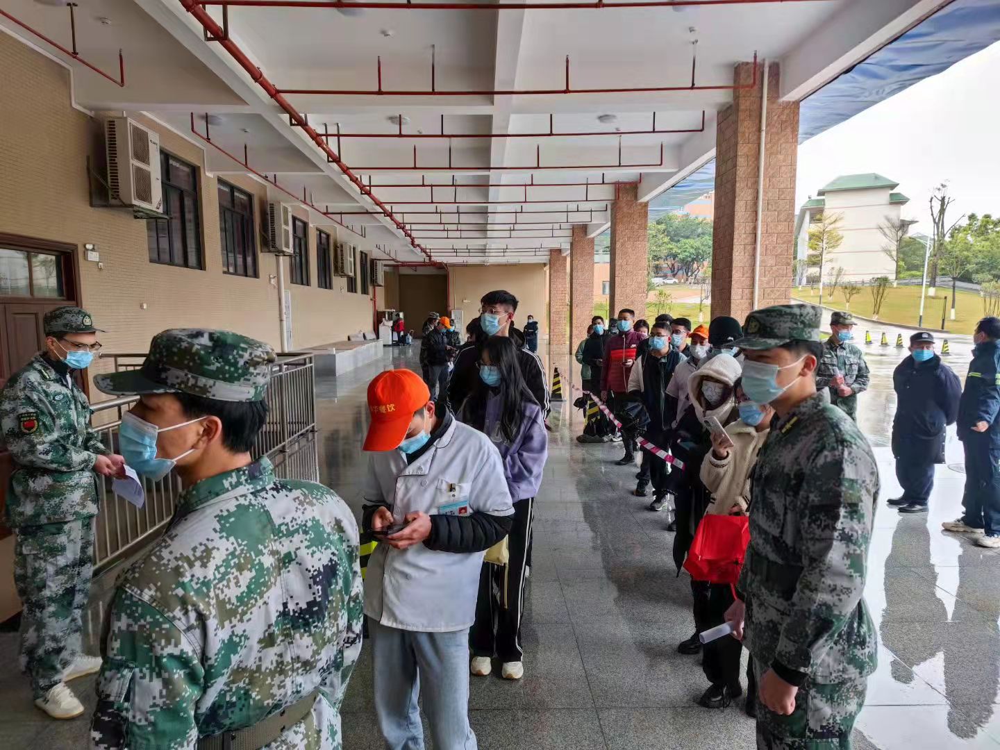 上午9:30分,受检人员严格遵守校园封闭检测管理相关要求,采样过程全部自觉排队、佩戴口罩、保持间距,在退伍复学员工为主体的志愿者引导下有序进入检测场地,经工作人员登记核对信息,完成咽拭子采集后,迅速离场。