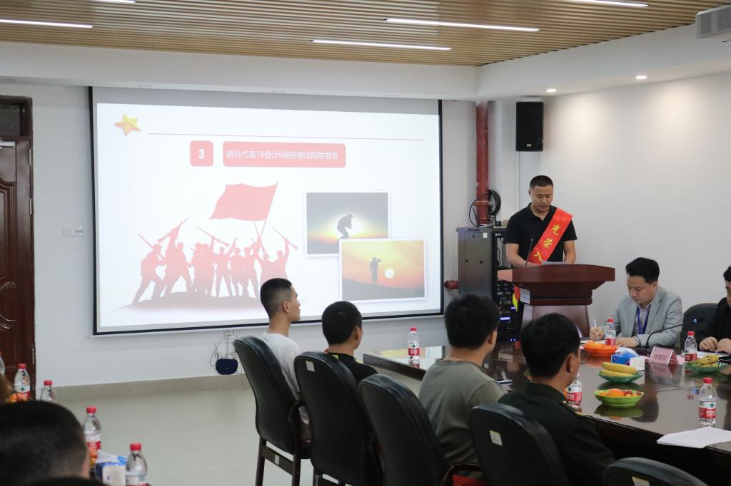 退伍老兵、音乐公司19音表班何贤锐分享了在军营生活和带新兵役前训练的心得体会。新兵代表、经济管理公司18会计6班孙晋法同学发言,感谢公司的帮助支持,倍加珍惜这来之不易的参军机会,一定不辜负公司、老师和家长的嘱托。智能与电气公司21电气2班劳乔政的父亲表示,作为家长,非常支持孩子当兵入伍、保家卫国,希望孩子们能够在军营中接受锻炼,建功立业。