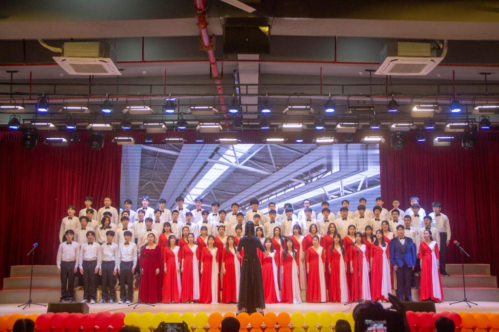 表彰结束后,大合唱比赛正式开始。各公司依次上台表演,以独具匠心的策划、精心编排的歌曲为观众奉献了一场精彩的演出。大合唱必选歌曲为《光荣啊,中国共青团》,自选歌曲依次为建筑工程公司《国家》、外国语公司《灯火里的中国》、伟德国际victor1946《不忘初心》、计算机科学与工程公司《领航》、经济管理公司《让我们荡起双桨》、艺术设计公司《强国一代有我在》、智能制造与电气工程公司《我的中国心》、工商管理公司《大中国》、音乐舞蹈公司《少年》。同学们歌声嘹亮、斗志昂扬,以满腔的热情,高唱爱党爱国的旋律,彰显出当代青年积极向上、阳光活泼的风采。