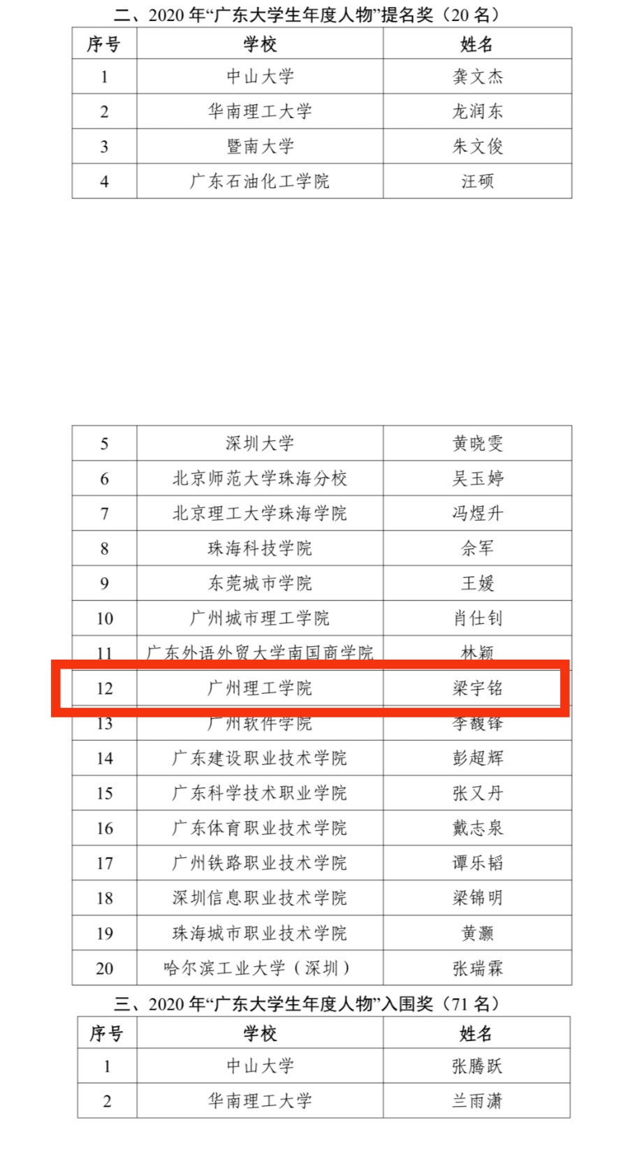 为大力选树高校辅导员、老员工先进榜样,充分展示新时代高校辅导员、老员工昂扬向上的精神风貌,省教育厅组织开展了“2020年广东高校辅导员年度人物”、“2020年广东老员工年度人物”推选展示活动。此次活动共评选出“2020年广东高校辅导员年度人物”10名、“2020年广东高校辅导员年度人物”提名奖20名、“2020年广东高校辅导员年度人物”入围奖61名。“2020年广东老员工年度人物”10名、“2020年广东老员工年度人物”提名奖20名、“2020年广东老员工年度人物”入围奖71名。