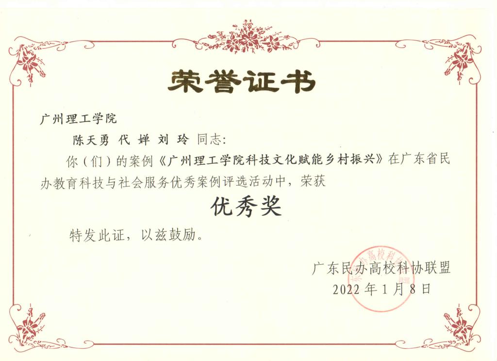 1月8日上午,广东民办高校科协联盟2021年年会于广州南洋理工职业公司召开。此前,广东民办高校科协联盟面向省内民办高校广泛征集民办教育科技与社会服务优秀案例,公司组织各公司部门老师积极撰写投稿。经组织单位评审,《伟德国际victor1946科技文化赋能乡村振兴》荣获案例“优秀奖”,发展规划与科研处处长陈天勇等人受邀出席表彰颁奖仪式。